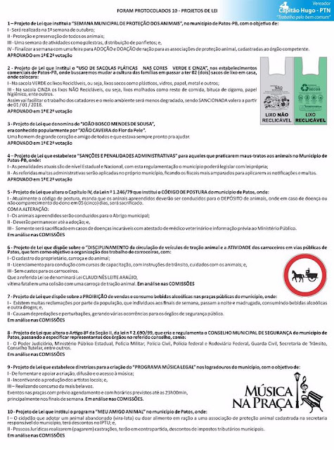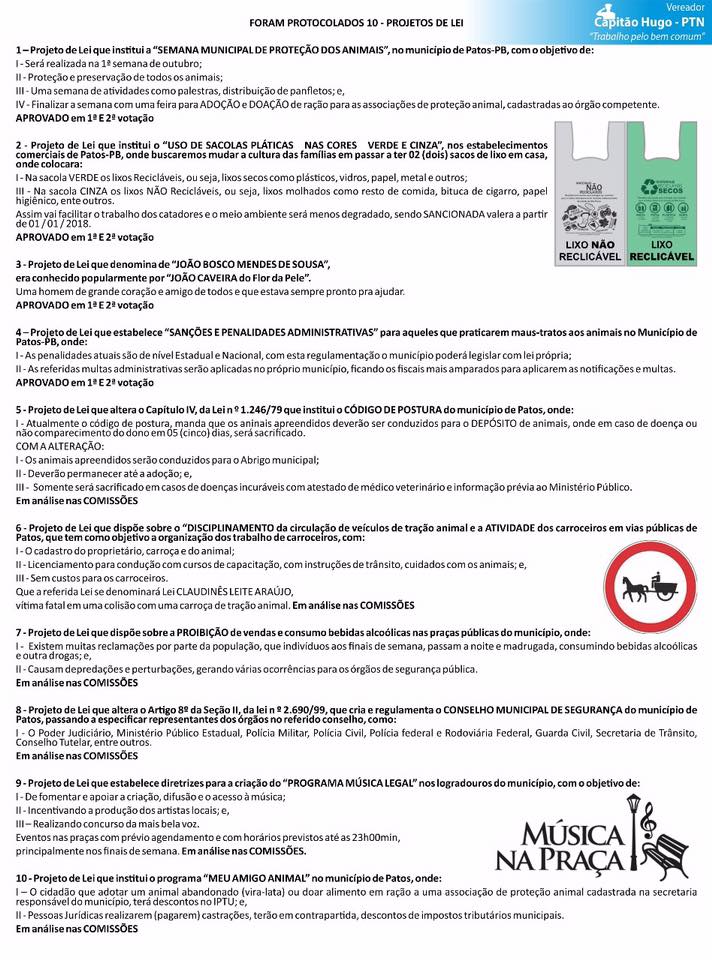 Foram 10 (dez) Projetos de Lei protocolados, 4 já aprovados em primeira e segunda votação.