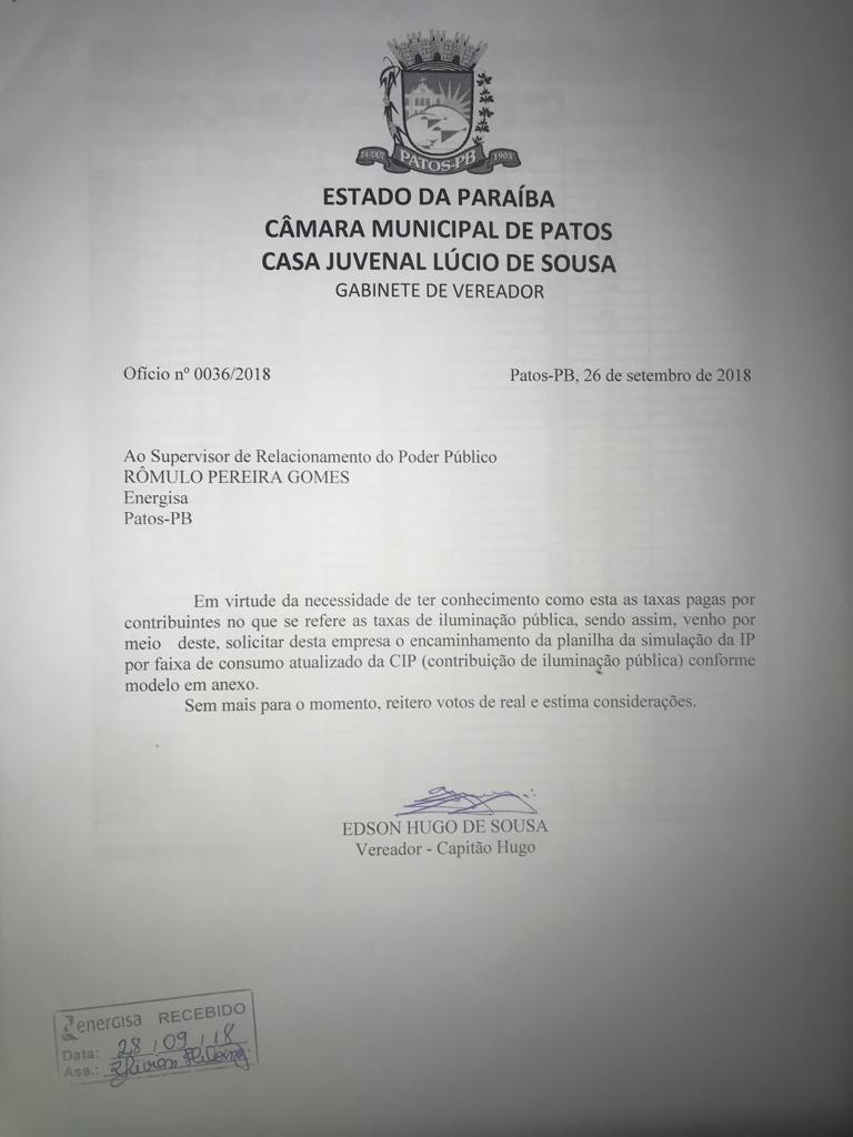 Neste dia 28 de setembro de 2018, solicitamos do Supervisor de Relacionamento de Poder Público da empresa Energisa o senhor Rômulo Pereira Gomes, cópia da planilha da simulação da IP por faixa de consumo atualizado da CIP (Contribuição de iluminação pública), Ofício em anexo.
