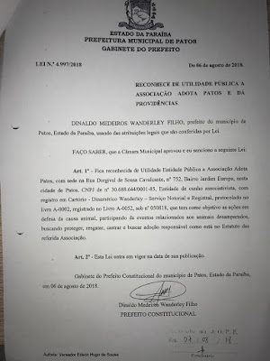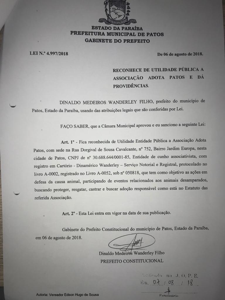 Neste dia de hoje 26 de novembro de 2018, encaminhamos através do Ofício nº 0046/2018 de 26/11/18 em (anexo) para o prefeito em execício o Senhor Bonifácio Rocha de Medeiros, solicitando uma subvenção para a Associação Adota Patos.