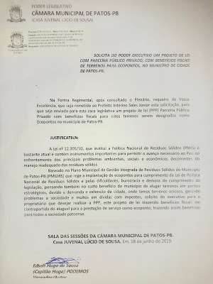 Neste dia 18 de junho de 2019, protocolamos um requerimento para o prefeito municipal de Patos, solicitando que seja encaminhado para esta casa legislativa um Projeto de Lei para a implantação de ecopontos, como também trazendo benefício fiscais para terrenos privados.
