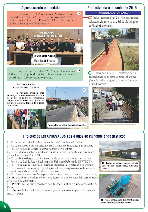 22 - Realizamos 02 Audiências Públicas sobre a Mobilidade Urbana em 2017 e 2019 com projetos de ciclovias, ciclofaixas e cobramos o Plano de Mobilidade Urbana da cidade de Patos que ainda não existe.