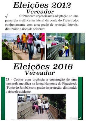 Por terem passados 4 anos, quando colocamos no plano de metas de campanha em 2012, repetimos em 2016 e passamos a cobrar a a construção da PASSARELAS METÁLICAS que devem ser construídas nas pontes do Argemiro de Figueiredo (ponte do Jatobá) e ponte da lateral da sangria do açude do Jatobá, ambas na zona sul que há muito tempo precisam ser realizados sua manutenção.