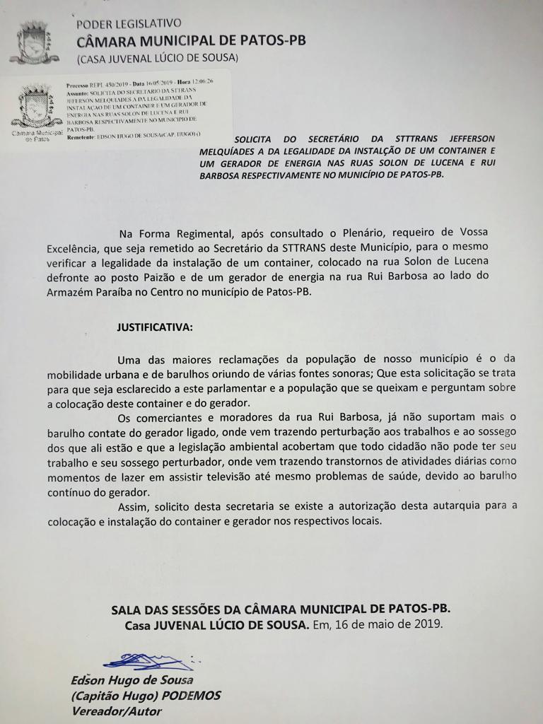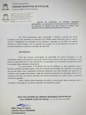 Na noite de ontem 16 de maio de 2019 na Sessão Ordinária da câmara de vereadores, protocolei requerimento solicitando das secretarias de Trânsito e Meio Ambiente para remeterem a informações sobre a existência de autorização para a colocação e permanência na via pública de um container e um gerador nas ruas Solon de Lucena e Rui Barbosa.